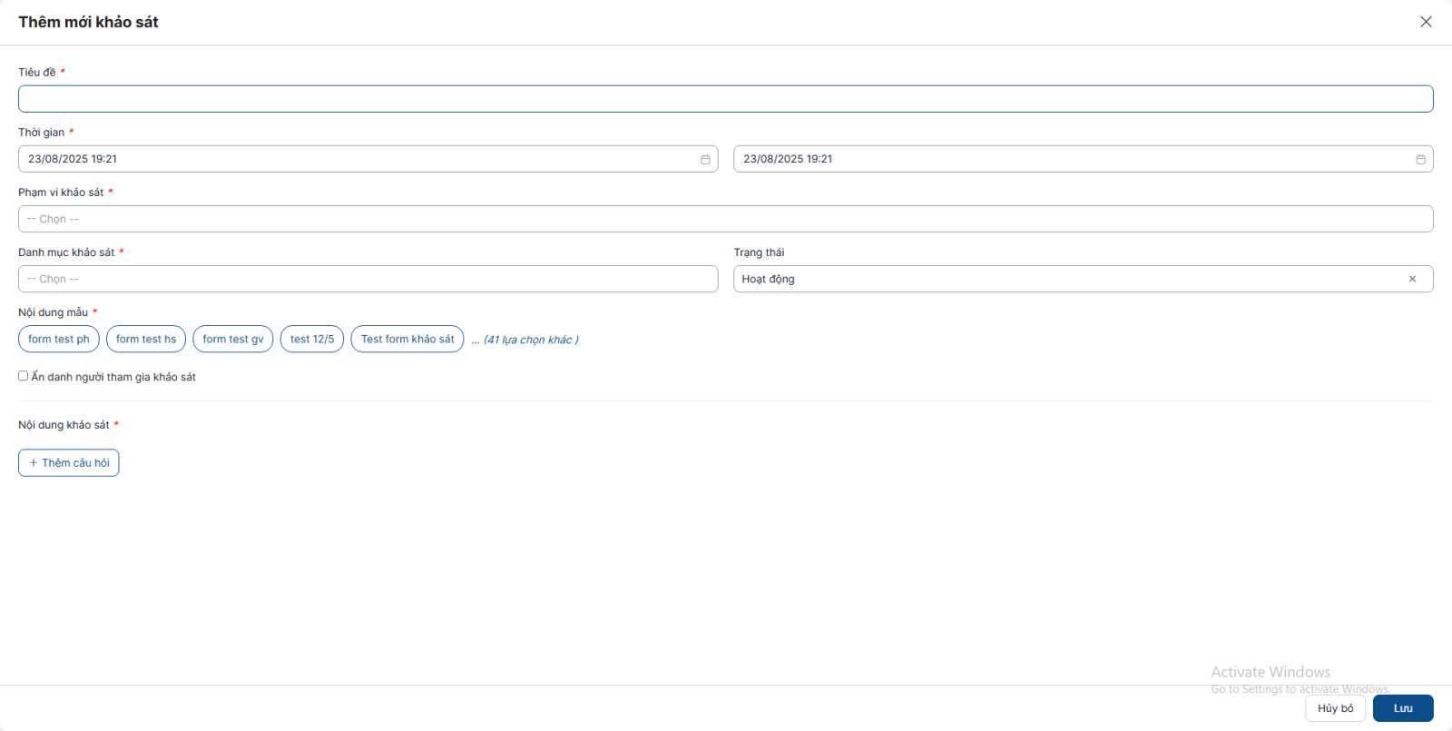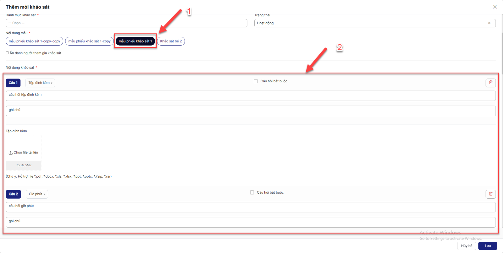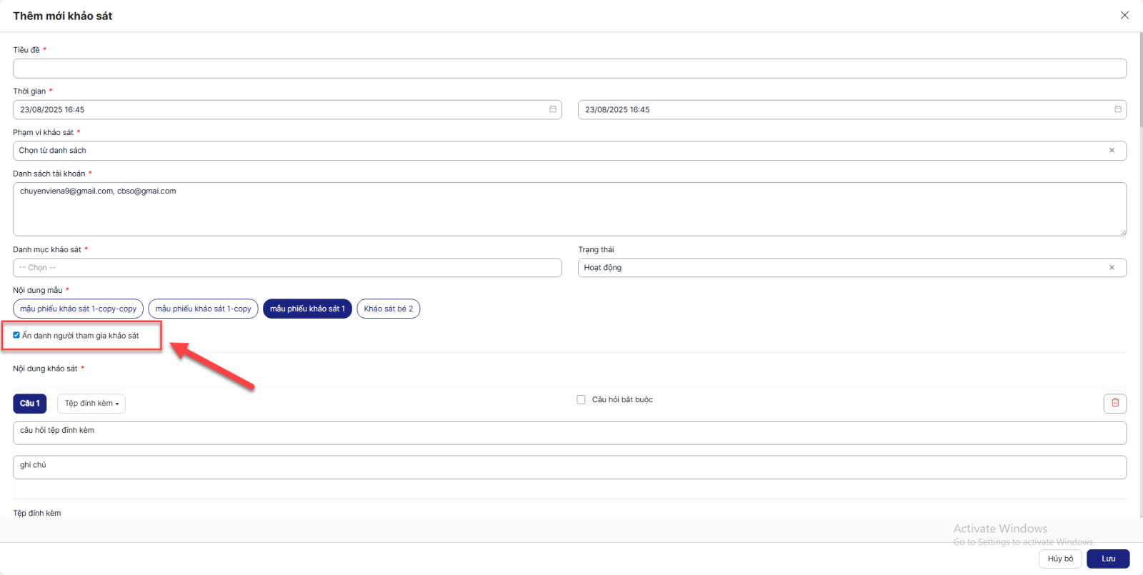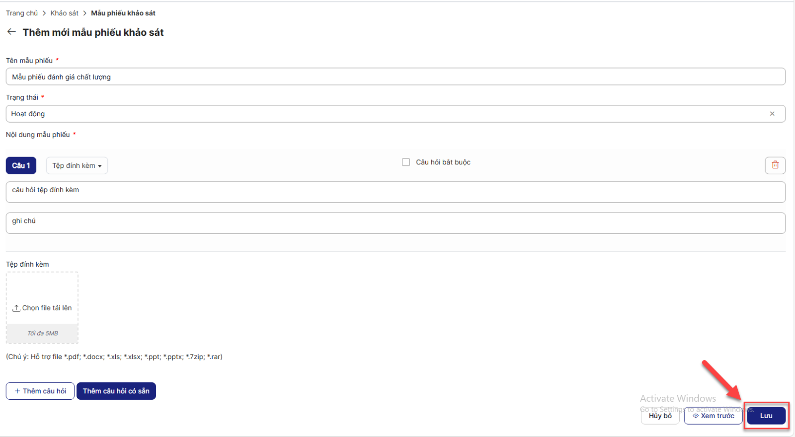 Bước 6: Sau khi hoàn thành chọn câu hỏi > Click Lưu để lưu lại mẫu phiếu