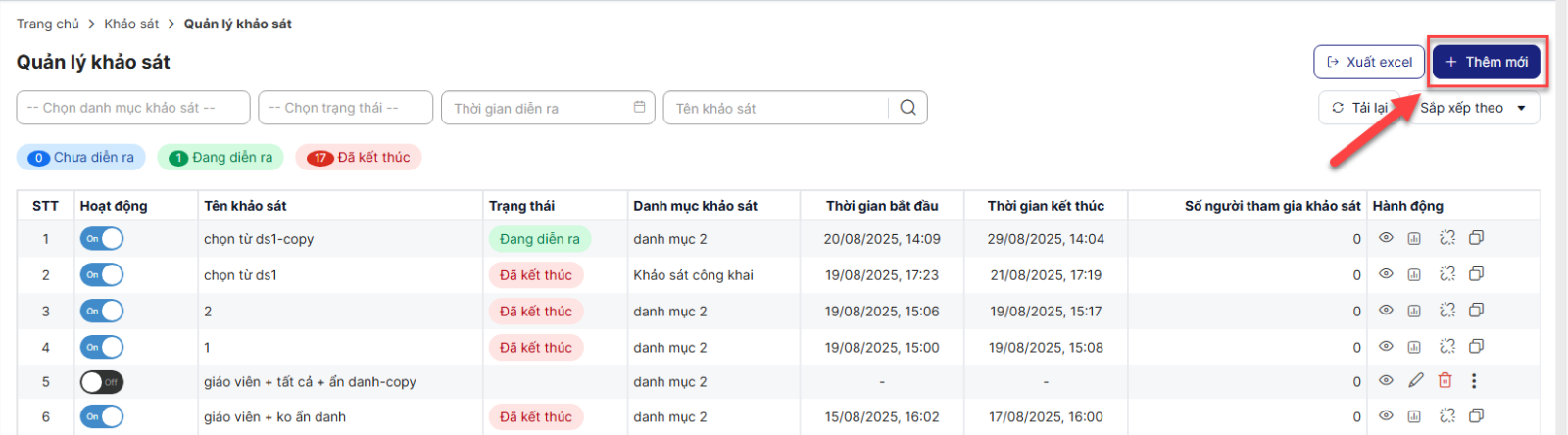 - Khảo sát ở trạng thái Đang diễn ra và Đã kết thúc có các hành động: Xem, báo cáo khảo sát, sao chép liên kết, sao chép khảo sát