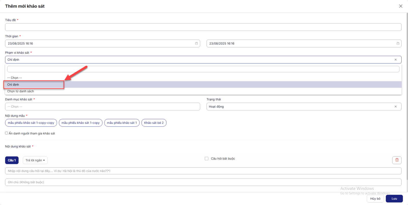 Bước 4.1: Click select box Phạm vi khảo sát > Chọn Chỉ định