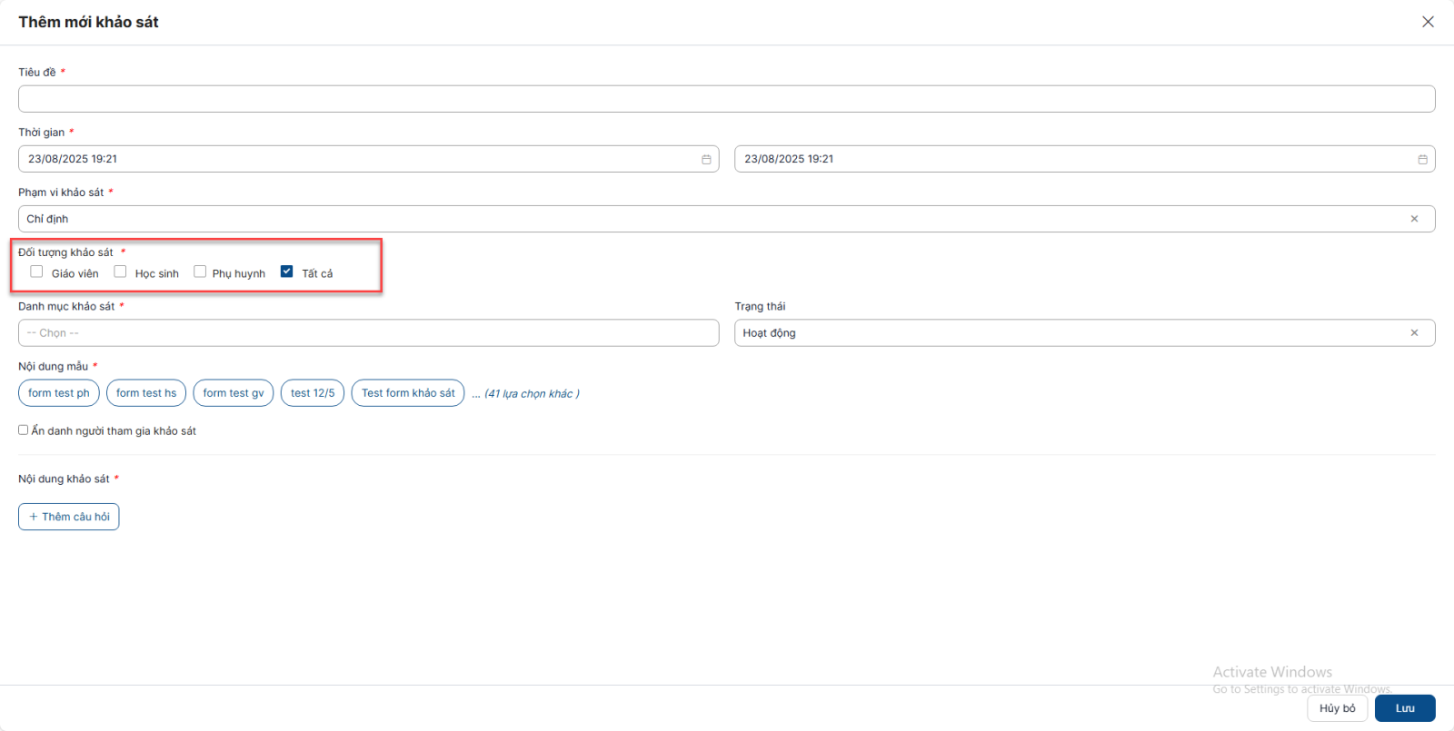 - Chọn Tất cả: Toàn bộ tài khoản giáo viên, học sinh, phụ huynh trên hệ thống và cả các khách vãng lai không đăng nhập cũng được nhìn thấy và làm khảo sát khi khảo sát Đang diễn ra