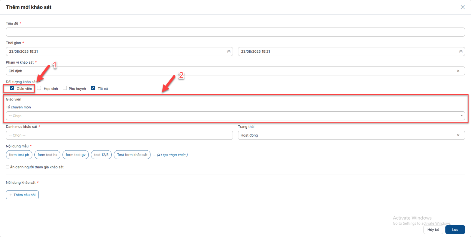 - Nếu không chọn điều kiện cụ thể thì tất cả các tài khoản Giáo viên, Học sinh, Phụ huynh trên hệ thống đều có thể nhìn thấy và vào làm khảo sát