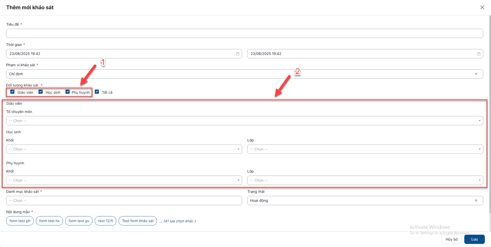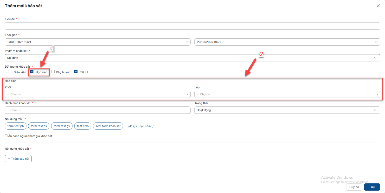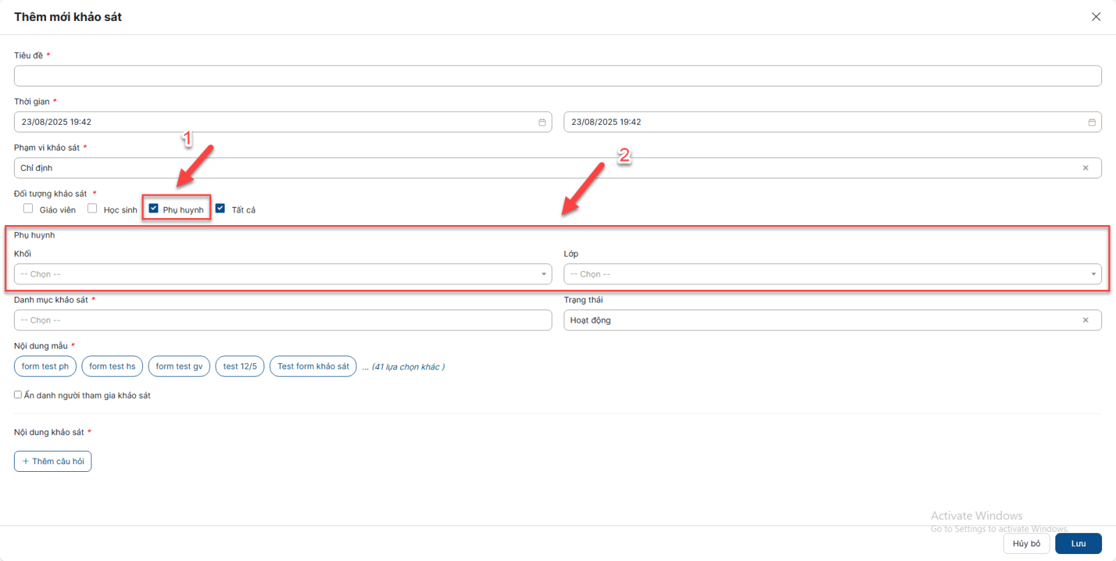 - Nếu chọn Khối, Lớp, thì chỉ phụ huynh có con thuộc Khối, Lớp đó đăng nhập vào hệ thống mới nhìn thấy và có quyền làm khảo sát khi khảo sát diễn ra (các tài khoản phụ huynh có con thuộc khối, lớp khác sẽ không nhìn thấy khảo sát).