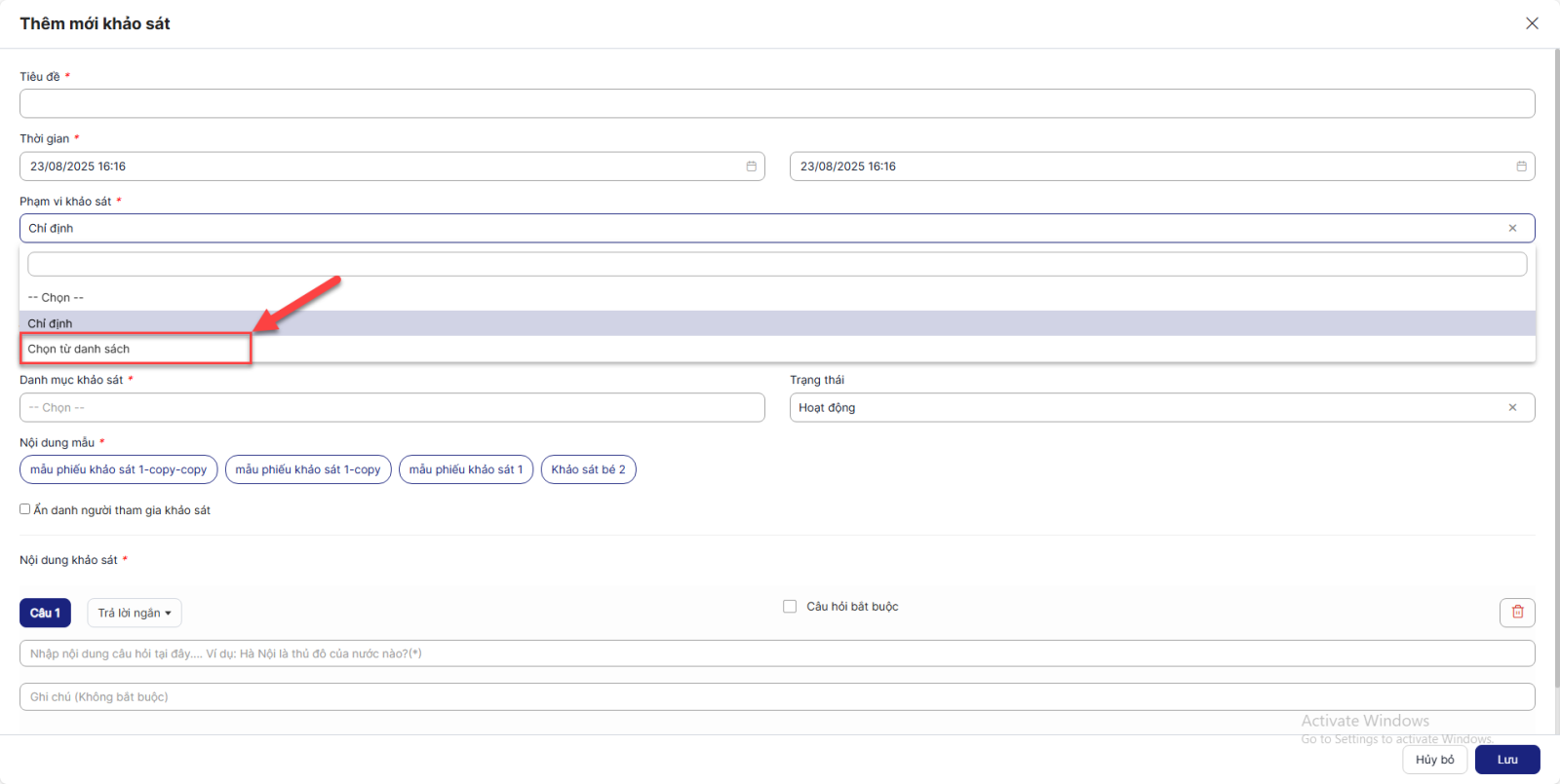 - Phạm vi khảo sát có 2 giá trị: Chỉ định và Chọn từ danh sách > Chọn giá trị nào sẽ hiển thị thêm các trường thông tin tương ứng (Cụ thể ở Bước 5)