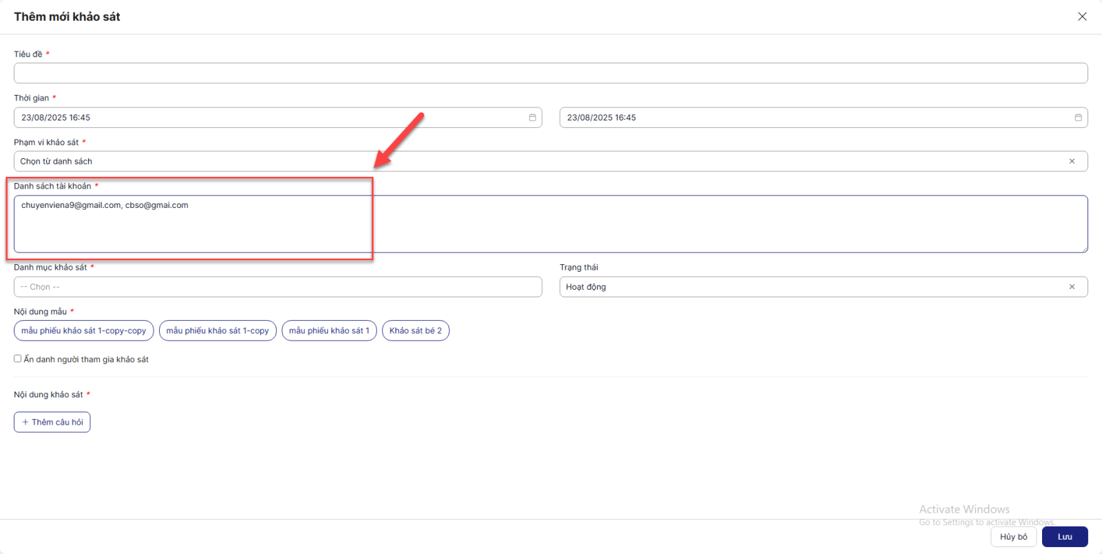- Chỉ các tài khoản được nhập ở đây mới có thể nhìn thấy và vào làm khảo sát khi khảo sát Đang diễn ra