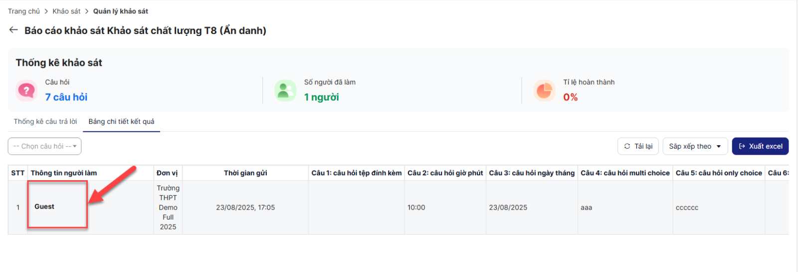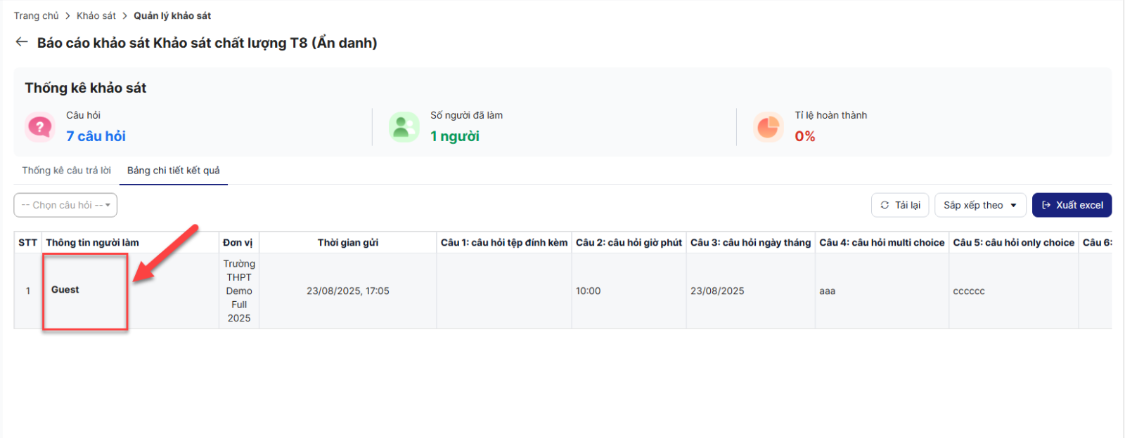 Nếu chọn ẩn danh người tham gia, vào xem báo cáo khảo sát sẽ không hiển thị thông tin người tham gia. Chỉ thể hiện bằng danh xưng chung là Guest: