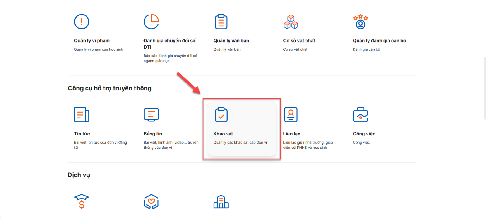 Bước 1: Đăng nhập vào web bằng tài khoản quản trị > Click module Khảo sát