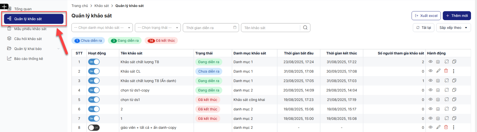 Bước 1: Trên thanh menu chọn menu Quản lý khảo sát > Màn hình hiển thị danh sách khảo sát
