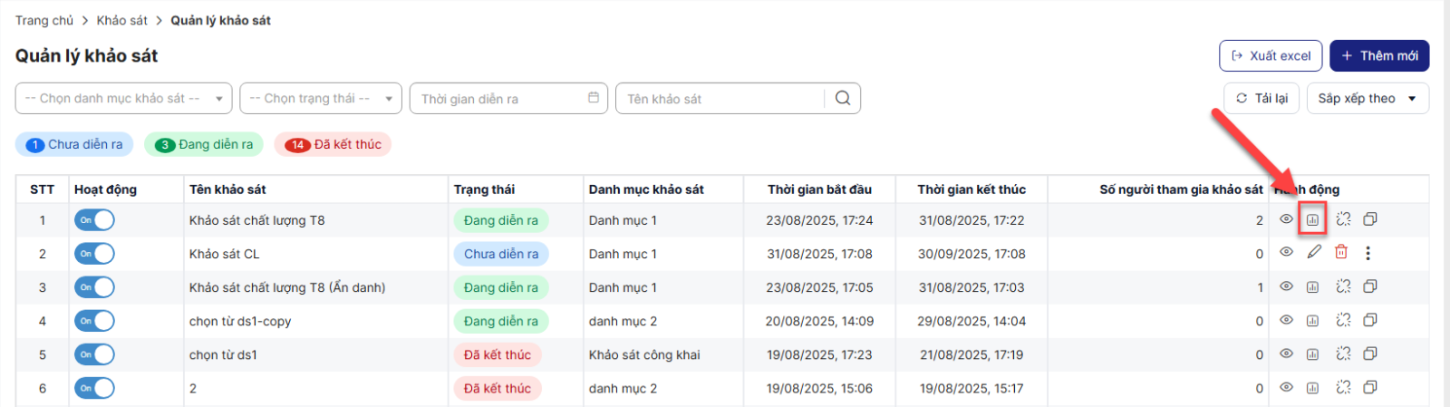 Bước 3: Click icon Báo cáo khảo sát (Tại khảo sát Đang diễn ra hoặc Đã kết thúc)