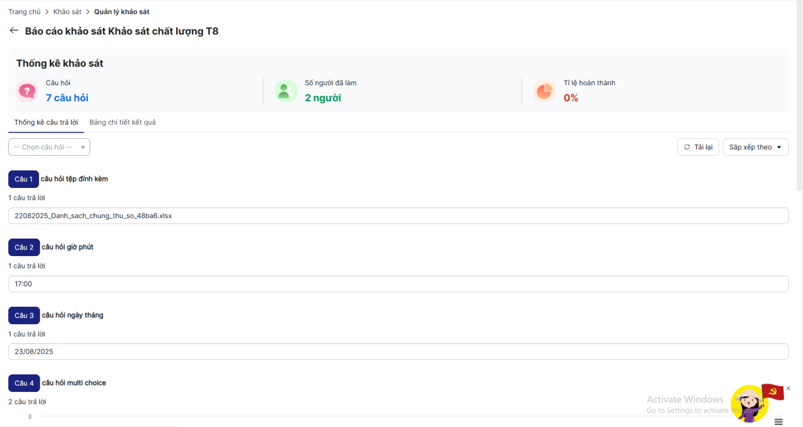 - Phần thống kê câu trả lời: Hiển thị tất cả các câu trả lời của người tham gia ở từng câu hỏi