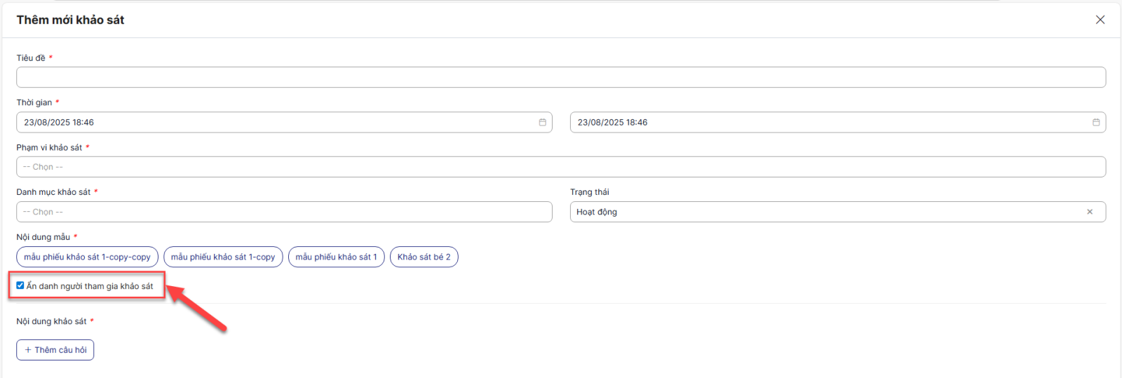 Bước 6: Click 1 giá trị ở Nội dung mẫu để chọn mẫu phiếu > Sau khi chọn hệ thống sẽ tự fill các câu hỏi trong mẫu phiếu đã chọn vào màn hình thêm mới khảo sát