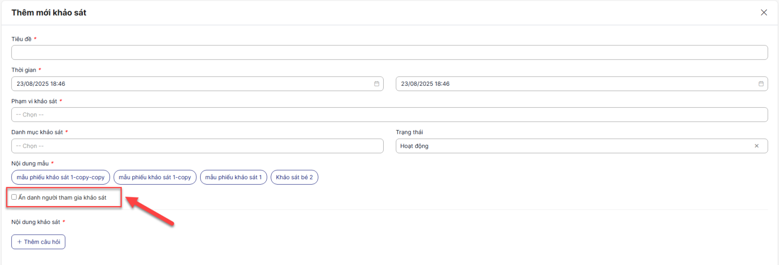 - Checkbox Ẩn danh người tham gia khảo sát: Khi chọn checkbox, các tài khoản vào làm sẽ được ẩn thông tin khi vào xem báo cáo khảo sát. Riêng với khách vãng lai thì vào làm khảo sát khi không đăng nhập sẽ không cần nhập thông tin cá nhân (Cụ thể ở Bước 7)