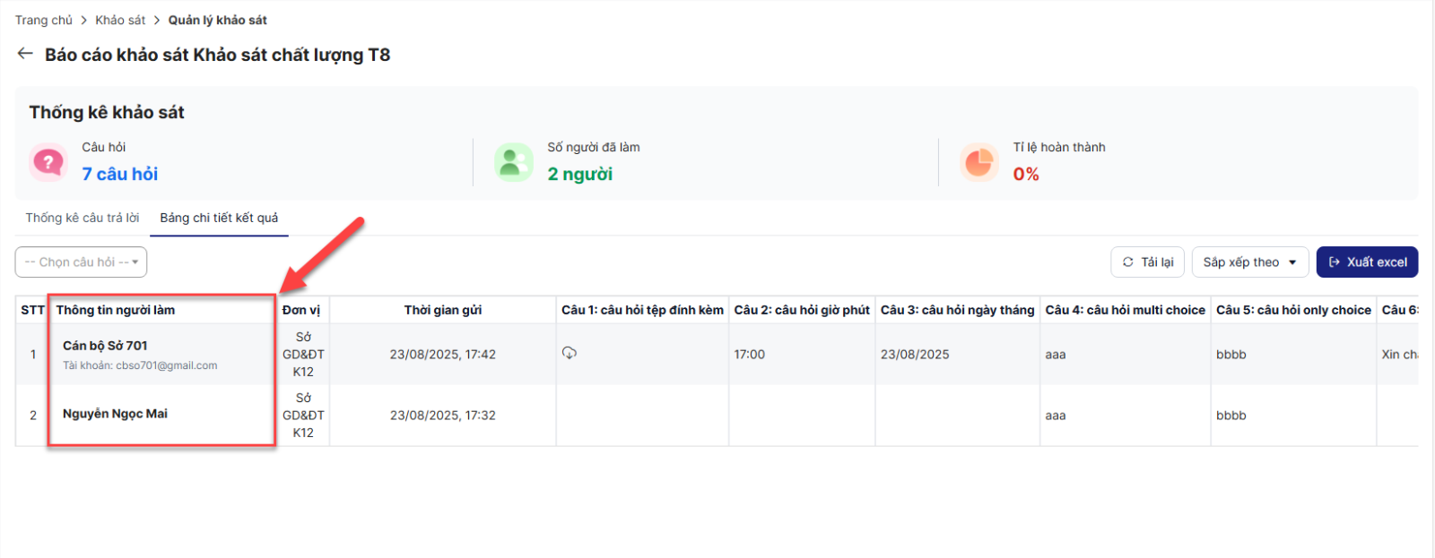 Click tab Bảng chi tiết kết quả từ màn hình Báo cáo khảo sát > Hiển thị danh sách câu trả lời của những người tham gia như hình: