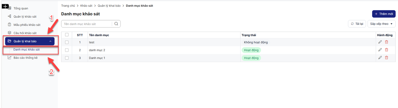 Trên thanh menu chọn Quản lý khai báo => chọn Danh mục khảo sát => Màn hình hiển thị danh sách danh mục khảo sát