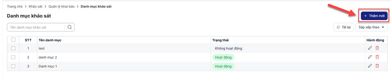 - Danh mục khảo sát: Hiển thị các bản ghi đang hoạt động ở menu Quản lý khai báo > Danh mục khảo sát