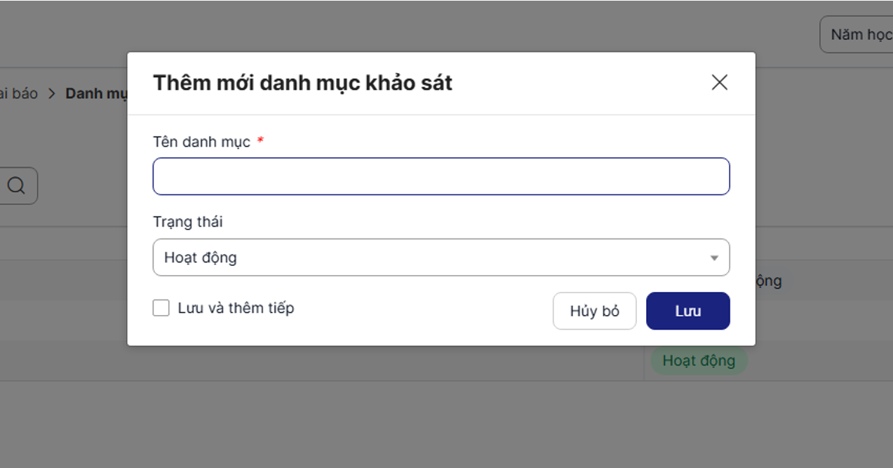 - Chỉ bản ghi ở trạng thái Hoạt động mới được hiển thị khi tạo khảo sát