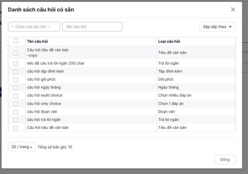 - Khi chọn câu hỏi có sẵn, các câu hỏi sẽ được thêm vào mẫu phiếu theo thứ tự chọn checkbox