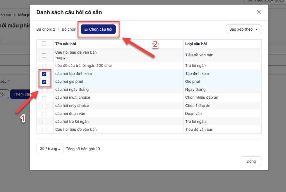 Bước 3.2: Click chọn checkbox ở các câu hỏi muốn thêm vào mẫu phiếu > Click button Chọn câu hỏi > Câu hỏi được thêm vào mẫu phiếu
