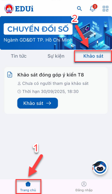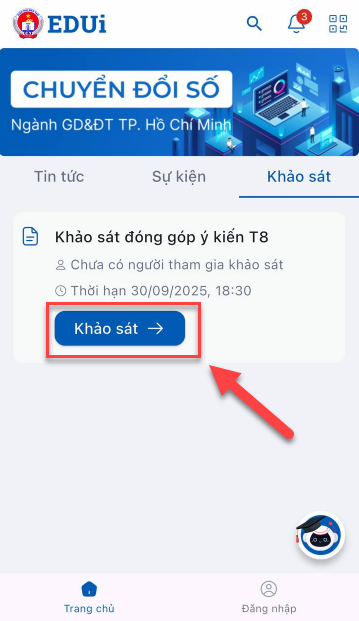 Bước 1: Truy cập vào app khi chưa đăng nhập > Nhấn Trang chủ > Nhấn tab Khảo sát