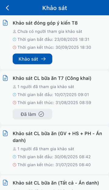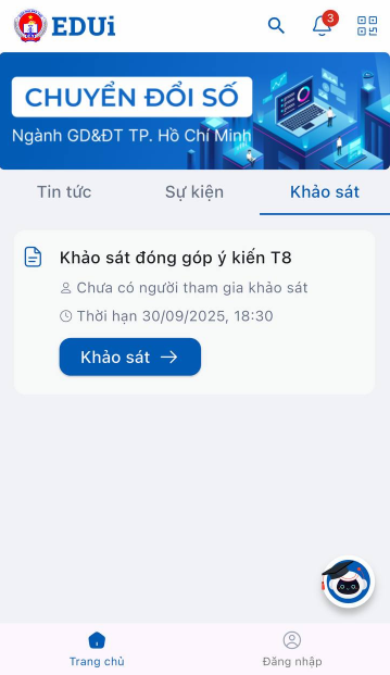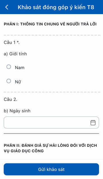 Lưu ý: Riêng với app, các tài khoản không đăng nhập chỉ có thể thấy được khảo sát công khai khi khảo sát đó được tạo từ trên Sở và không chọn đơn vị nào cụ thể (vì khi khảo sát được tạo riêng cho 1 trường thì dưới app cần đăng nhập tài khoản để vào được trường đó)
