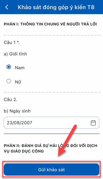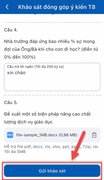 Bước 4: Sau khi trả lời đầy đủ các câu hỏi bắt buộc > Click button Gửi khảo sát để hoàn thành việc tham gia khảo sát