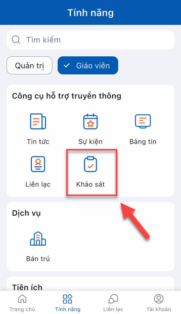 Bước 1: Đăng nhập vào hệ thống bằng tài khoản được quyền tham gia khảo sát > vào Tính năng > Chọn module Khảo sát
