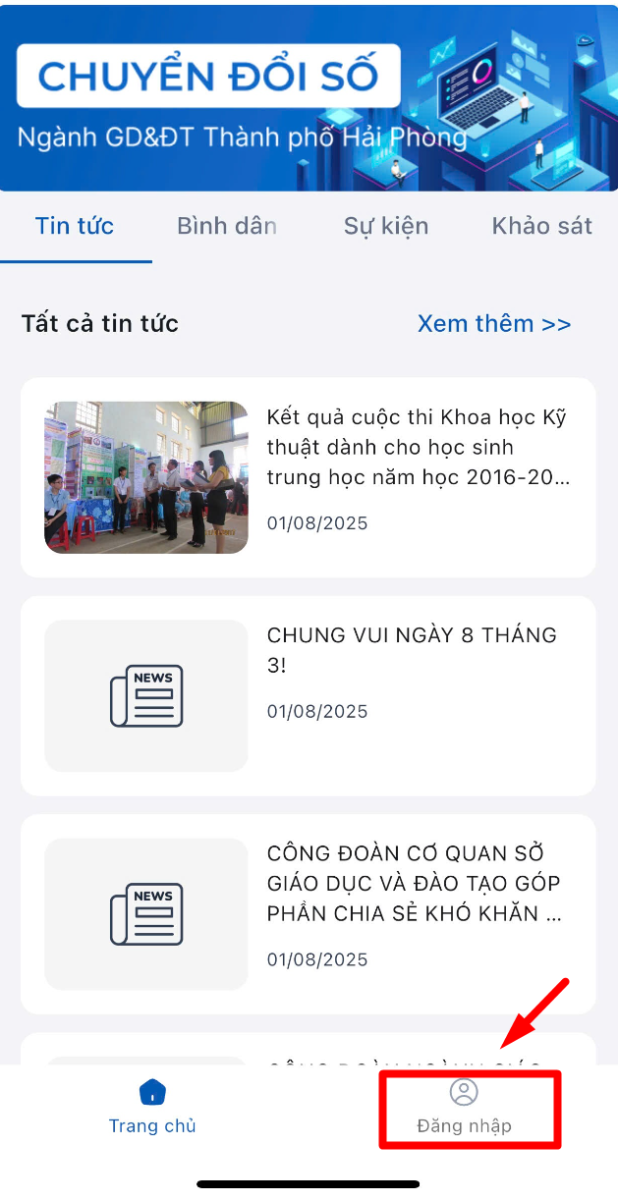 App-Hướng dẫn đăng nhập trên app Ứng dụng tương tác Ngành Lượt xem: 525 | Bước 1: Mở app → Đăng nhậpNhãn Bước 3: Nhập thông tin tài khoản, mật khẩu → Click vào đăng nhập Nhãn