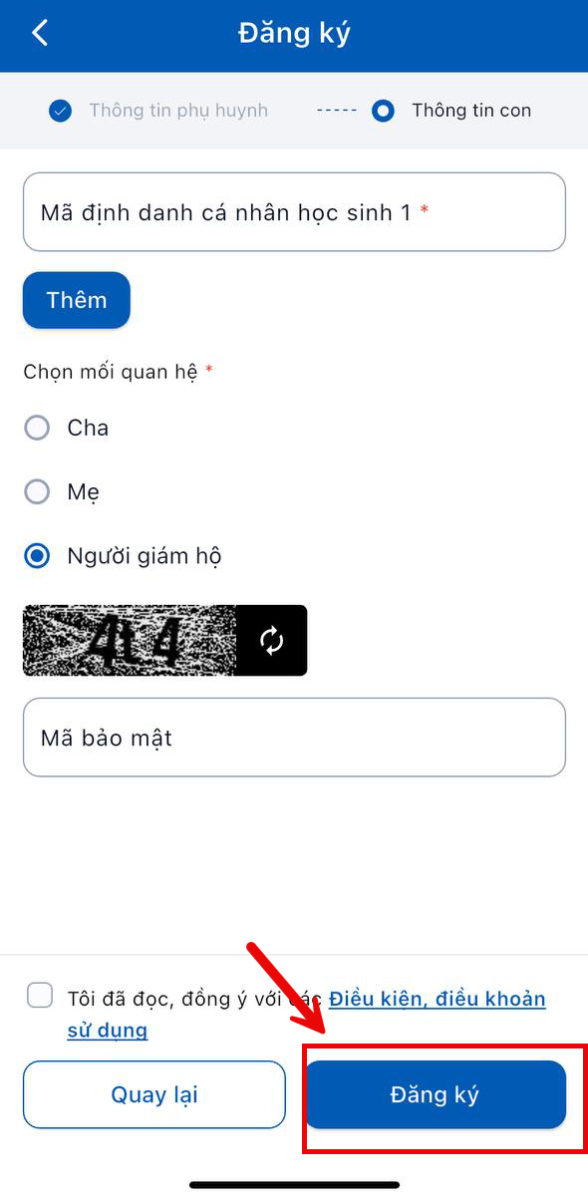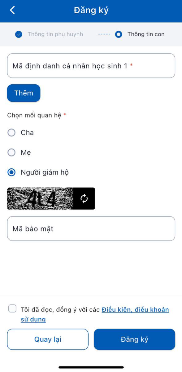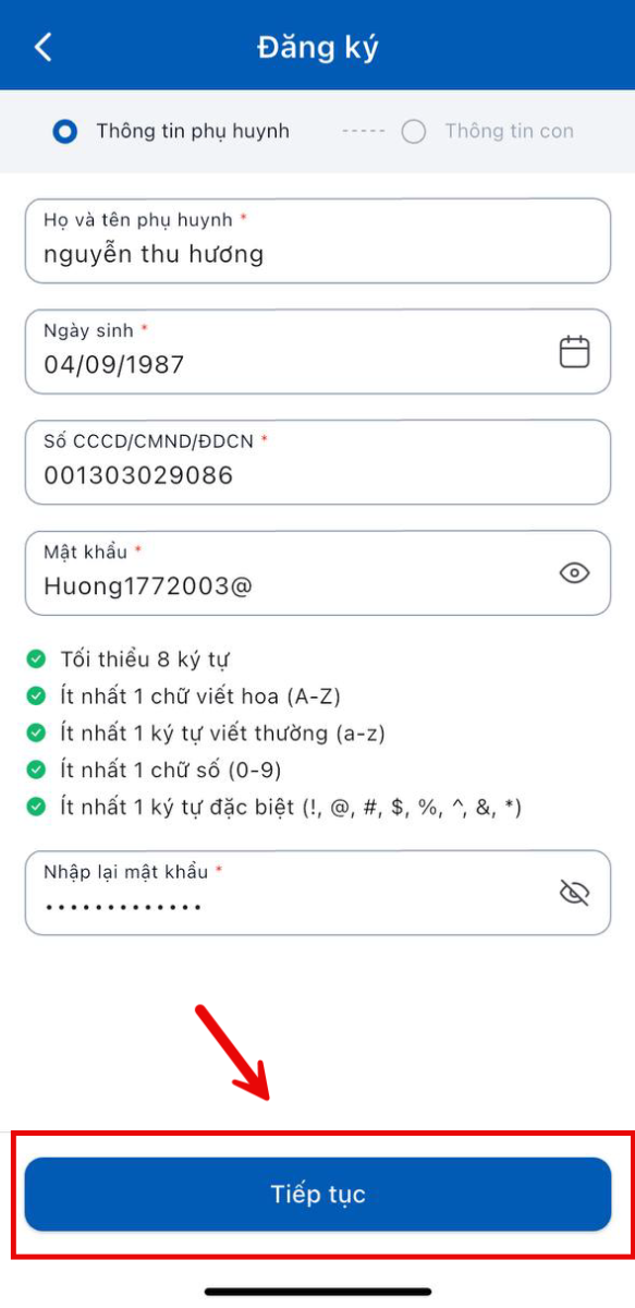 Bước 1: Sau khi nhập thông tin phụ huynh hợp lệ, ấn tiếp tục để chuyển sang tab Thông tin con