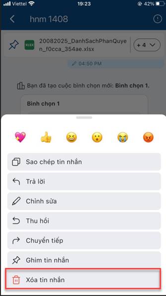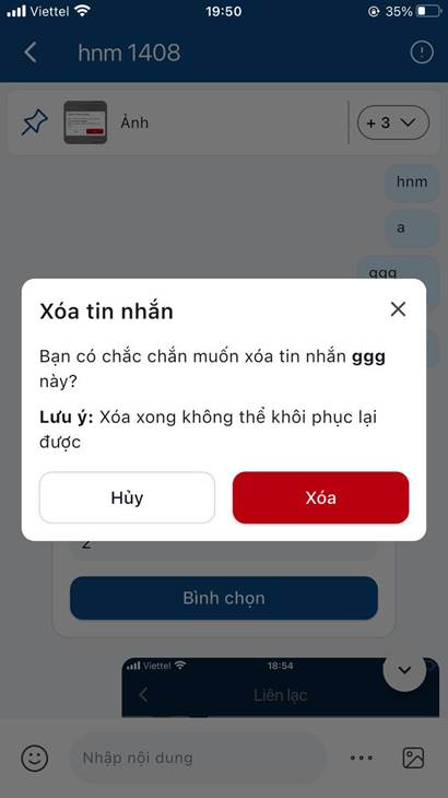 - Lưu ý: trong 1 đoạn chat nhóm, tài khoản là trưởng nhóm, phó nhóm được phép xóa tin nhắn của các thành viên khác, còn tài khoản thành viên chỉ được xóa tin nhắn của chính mình.