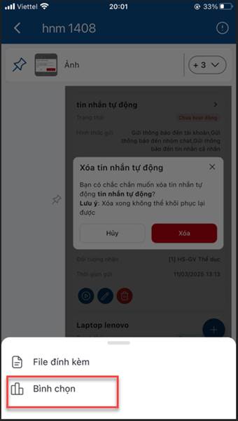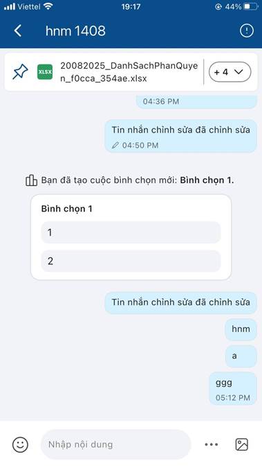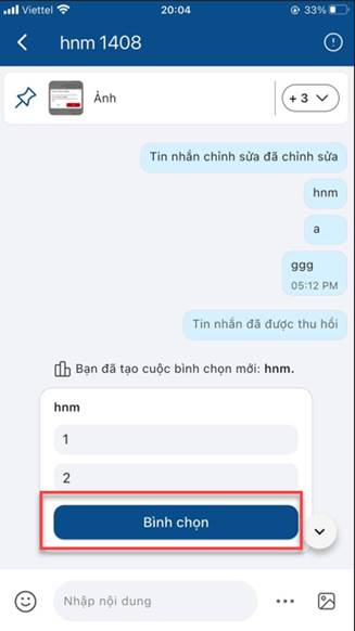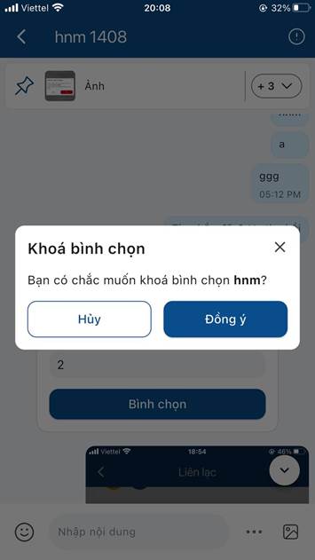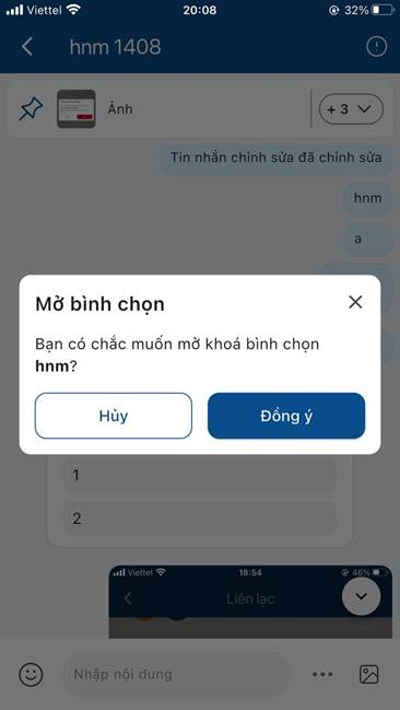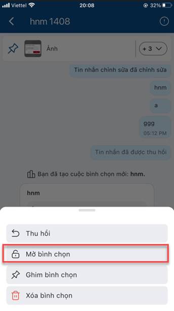 Bước 1: Trên màn hình danh sách đoạn chat > Nhấn vào 1 đoạn chat > Nhấn và giữ bình chọn do mình tạo đang bị khóa bình chọn> click Mở khóa bình chọn
