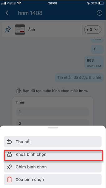 Bước 1: Trên màn hình danh sách đoạn chat > Nhấn vào 1 đoạn chat > Nhấn và giữ bình chọn do mình tạo> click Khóa bình chọn
