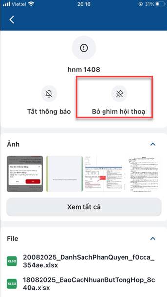 Bước 2: Nhấn bỏ ghim hội thoại > Thực hiện bỏ ghim hội thoại thành công, đoạn chat không còn được ghim ở đầu danh sách