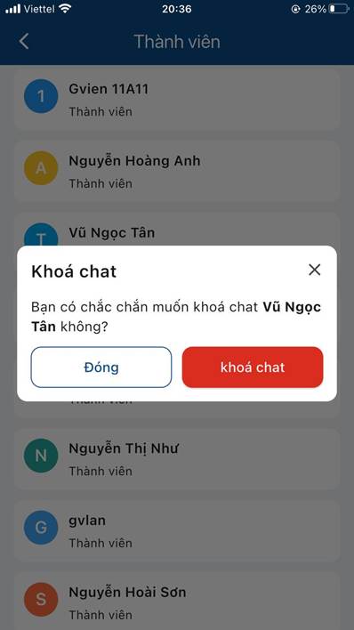 Bước 3: Nhấn và giữ thành viên muốn Khóa chat > Nhấn Khóa chat