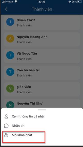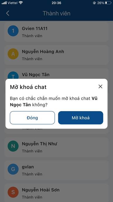Bước 3: Nhấn và giữ thành viên muốn Mở khóa chat > Nhấn Mở khóa chat
