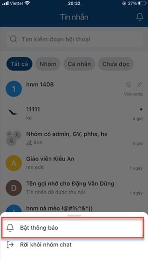 Bước 1: Trên màn hình danh sách đoạn chat > Nhấn và giữ vào 1 đoạn chat > Nhấn Bật thông báo