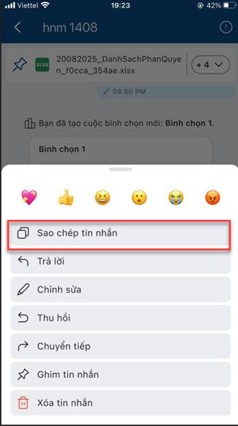 Bước 1: Trên màn hình danh sách đoạn chat > Nhấn vào 1 đoạn chat > Nhấn và giữ vào 1 tin nhắn dạng text hoặc emoji > nhấn Sao chép tin nhắn