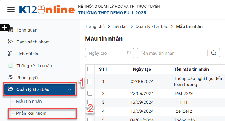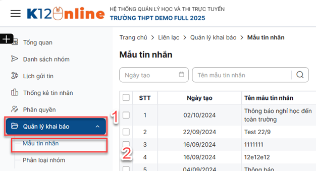 Bước 3: Click menu Quản lý khai báo > click menu Mẫu tin nhắn