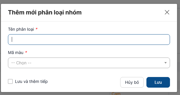 + Mã màu: Bắt buộc chọn, cho phép chọn 1, không cho phép chọn mã màu đã có bản ghi khác đã chọn