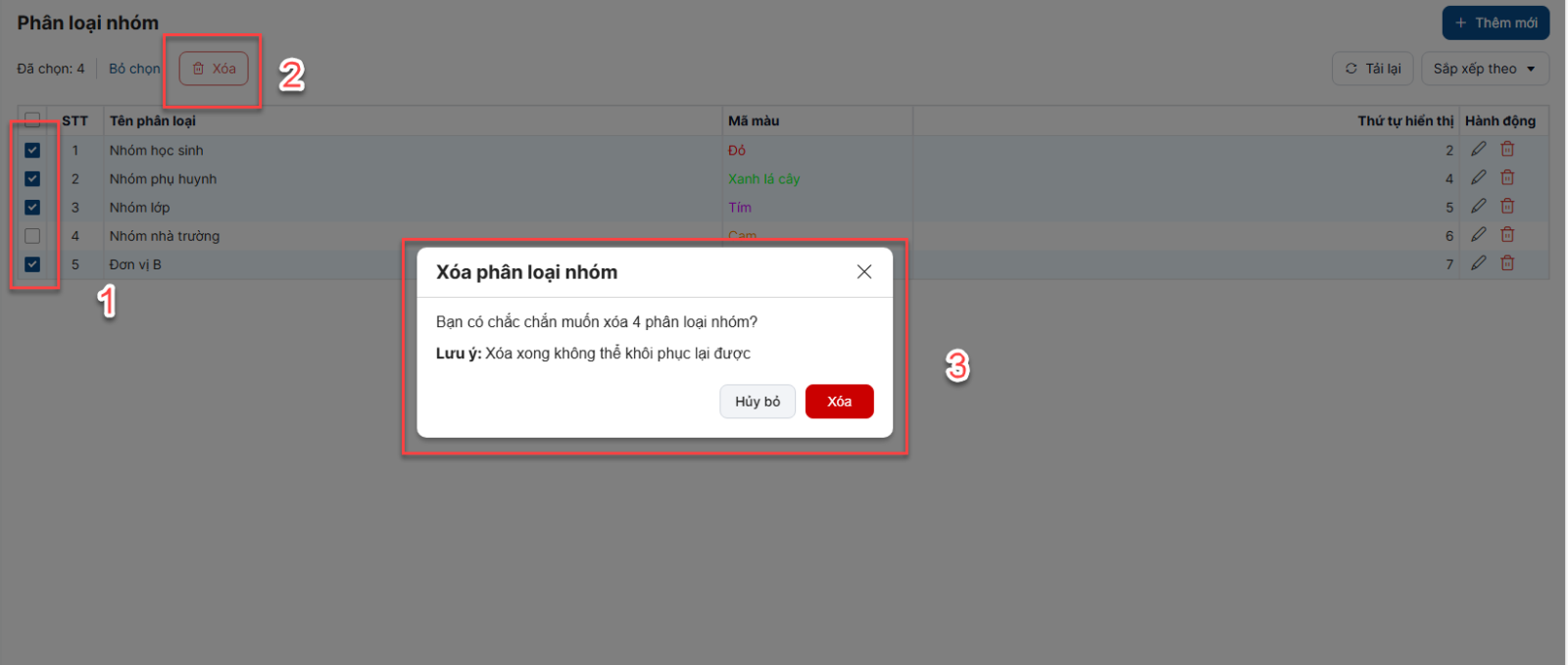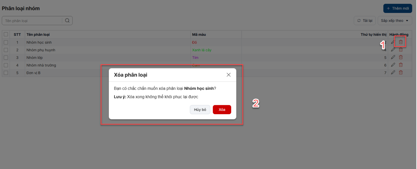 + Click Xóa để xác nhận xóa nhóm, bản ghi sẽ bị xóa khỏi danh sách