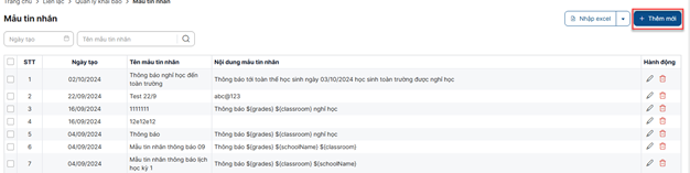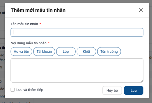 + Nội dung mẫu tin nhắn: Bắt buộc nhập, tối đa 500 ký tự, cho phép chọn các nội dung tin nhắn có sẵn để khi gửi tin nhắn hệ thống sẽ tự động điền thông tin của từng học sinh