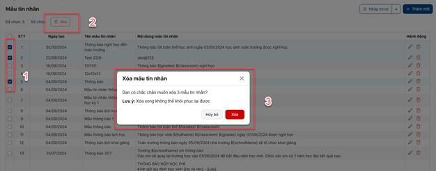 Bước 1: Trên màn hình danh sách > tích chọn checkbox các bản ghi muốn xóa > click Xóa > Hệ thống hiển thị popup xác nhận xóa