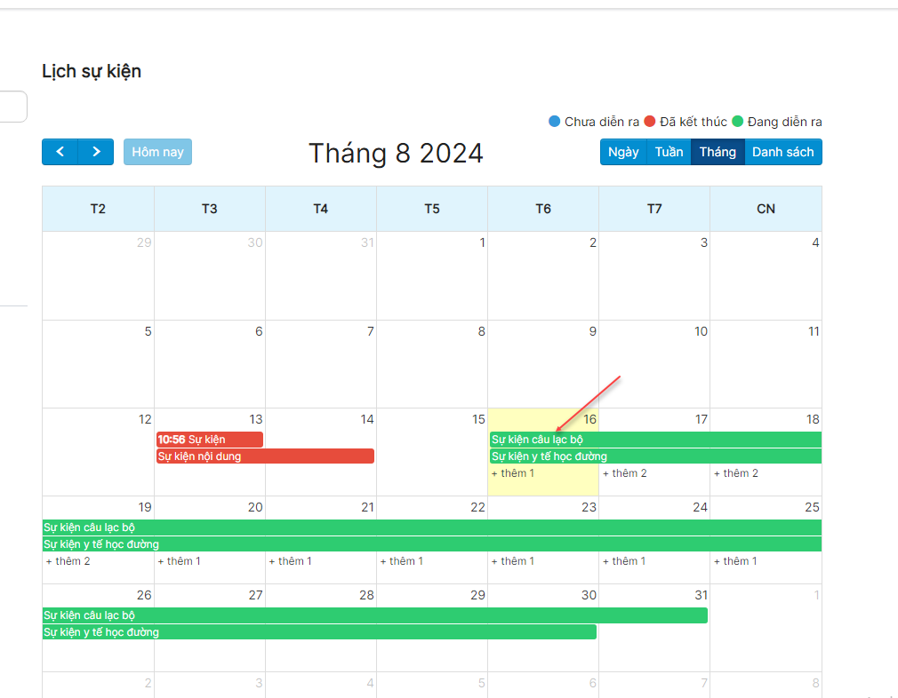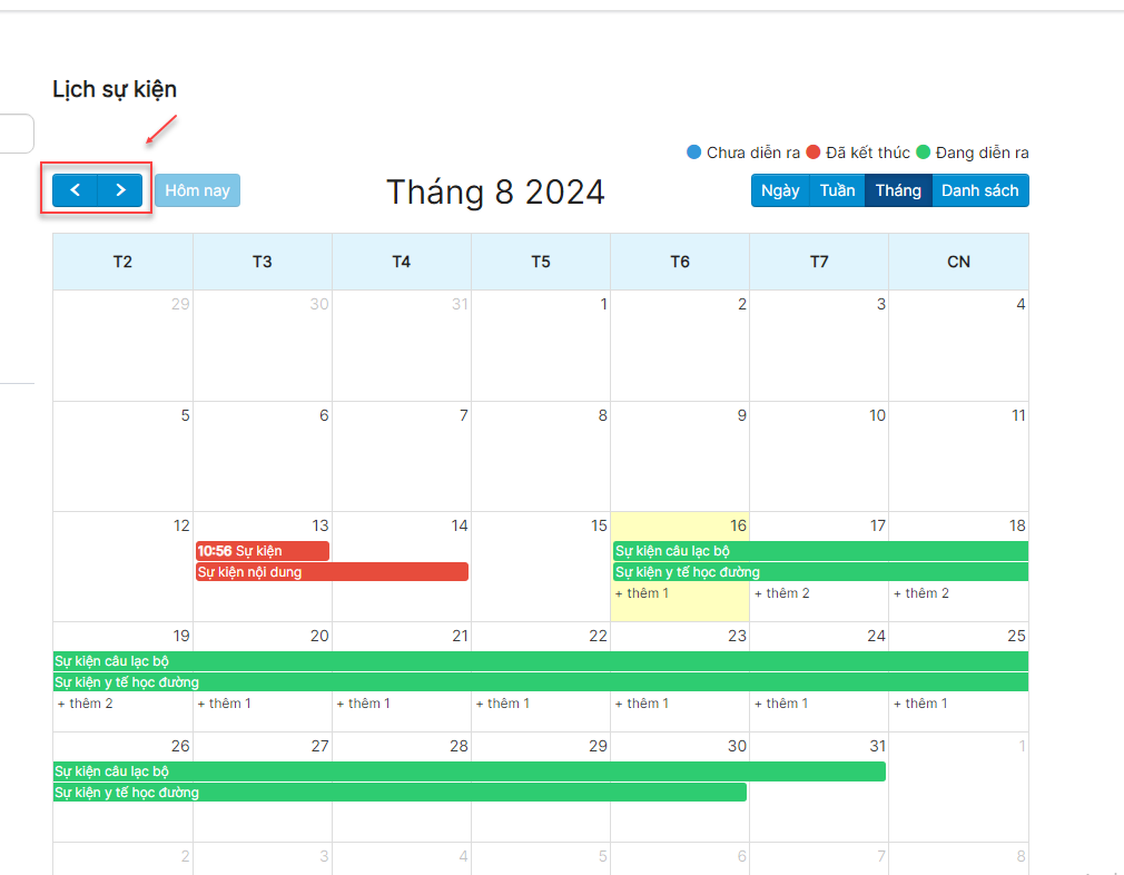 Bước 1: Click menu Lịch sự kiện > Xem danh sách sự kiện. Mặc định hiển thị dạng Tháng
