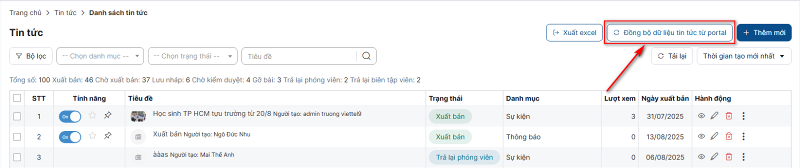 Bước 1: Danh sách > Click button Đồng bộ dữ liệu tin tức từ portal