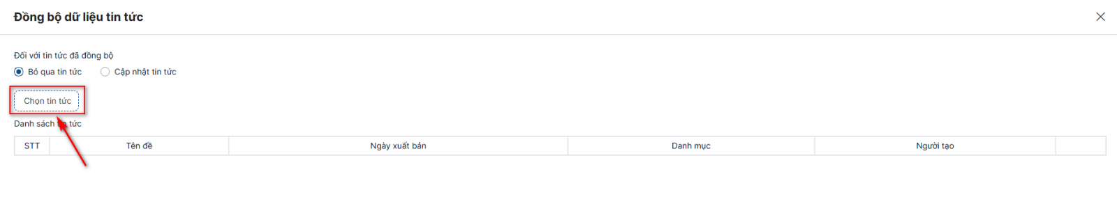 Bước 3: Ở form đồng bộ dữ liệu tin tức > click button Chọn tin tức