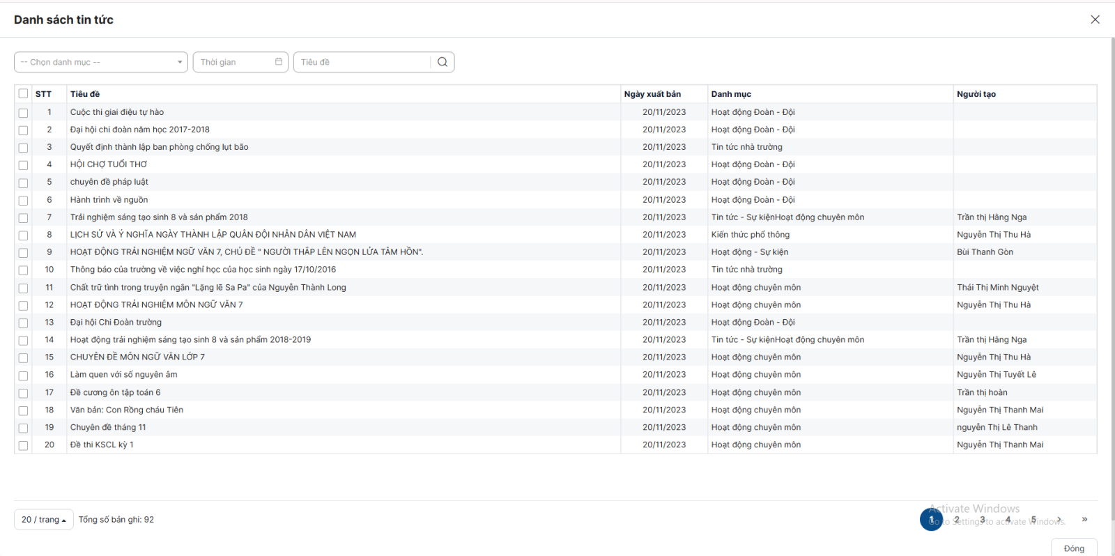 Bước 4: Hệ thống hiển thị danh sách tin tức của trang portal tương ứng với từng đơn vị (hiển thị tin tức trạng thái xuất bản và đang hoạt động)