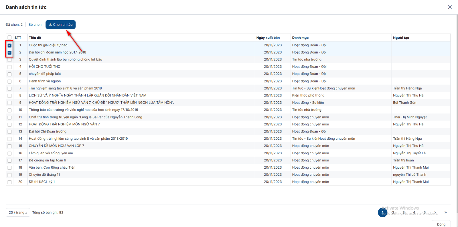 Bước 5: Click checkbox đầu các tin tức muốn đồng bộ về > click button Chon tin tức > những bản tin được chọn hiển thị ở danh sách