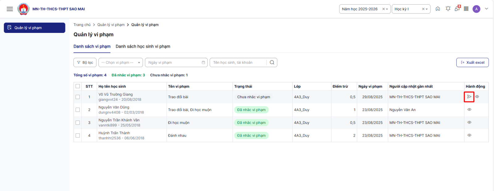 Bước 1: Giáo viên truy cập module Quản lý vi phạm > Tại màn hình danh sách vi phạm, giáo viên chọn các bản ghi ở trạng thái "Chưa nhắc vi phạm" > click vào icon của bản ghi chứa học sinh cần nhắc nhở.