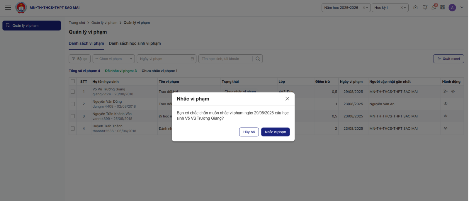 Bước 3: Hiển thị popup xác nhận Nhắc vi phạm > Click Nhắc vi phạm để thực hiện nhắc nhở và phụ huynh của học sinh đó sẽ nhận được thông tin vi phạm của con mình. Đồng thời, bản ghi chứa vi phạm chuyển trạng thái "Đã nhắc vi phạm".