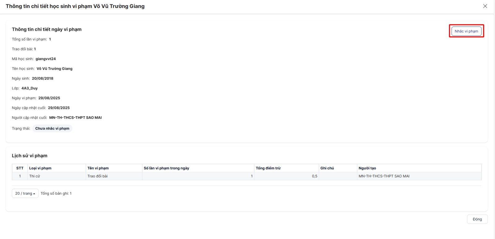 Bước 2: Hệ thống hiển thị màn hình Thông tin chi tiết học sinh vi phạm > giáo viên click vào button Nhắc vi phạm.