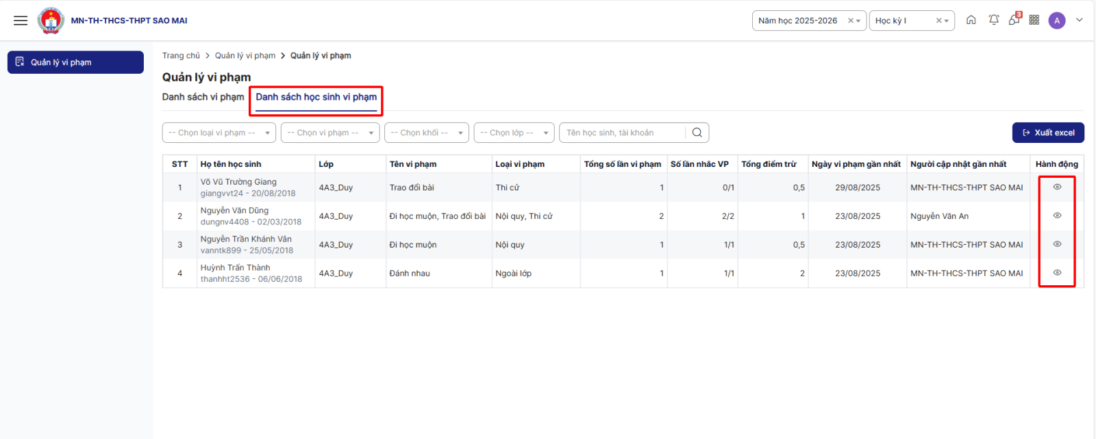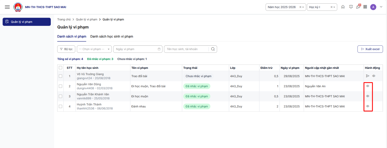 Bước 1: Giáo viên truy cập module Quản lý vi phạm > Tại màn hình danh sách chọn tab Danh sách học sinh vi phạm, giáo viên click vào icon của bản ghi chứa học sinh cần xem chi tiết.