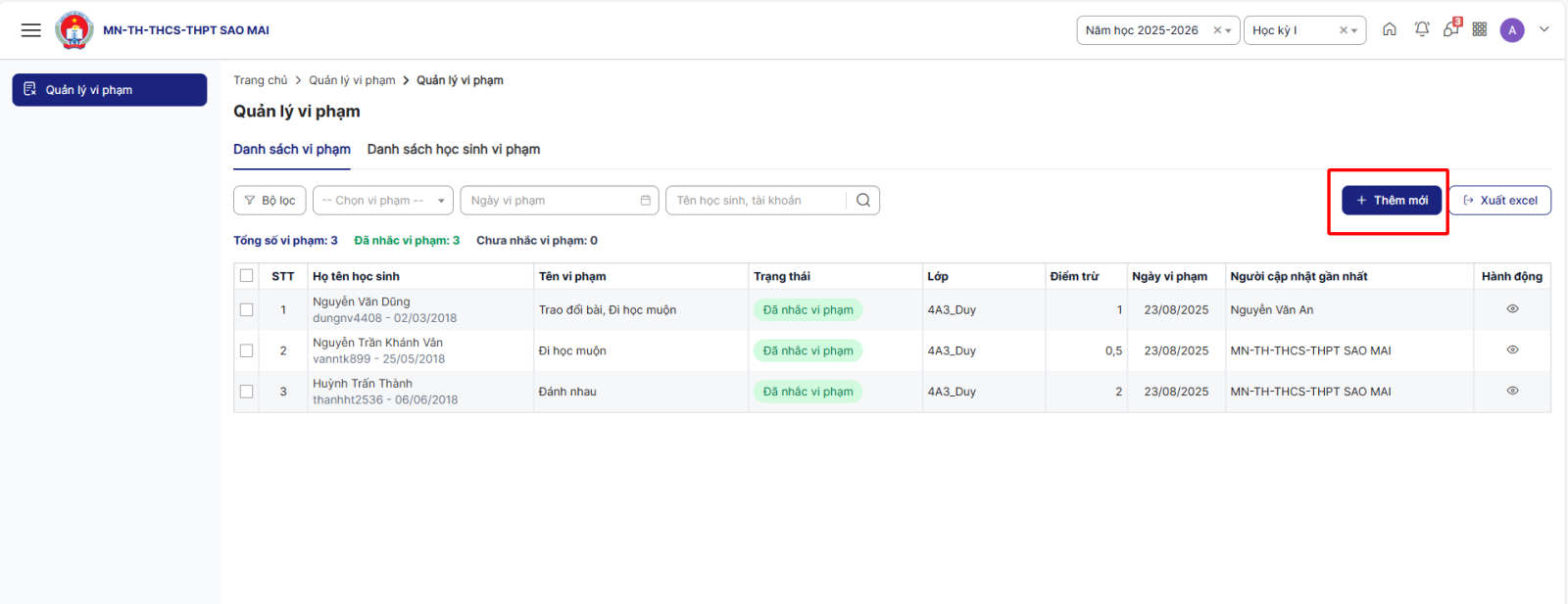 Lưu ý: Tính năng Thêm mới vi phạm chỉ hiển thị với các Giáo viên được phân công là Giám thị